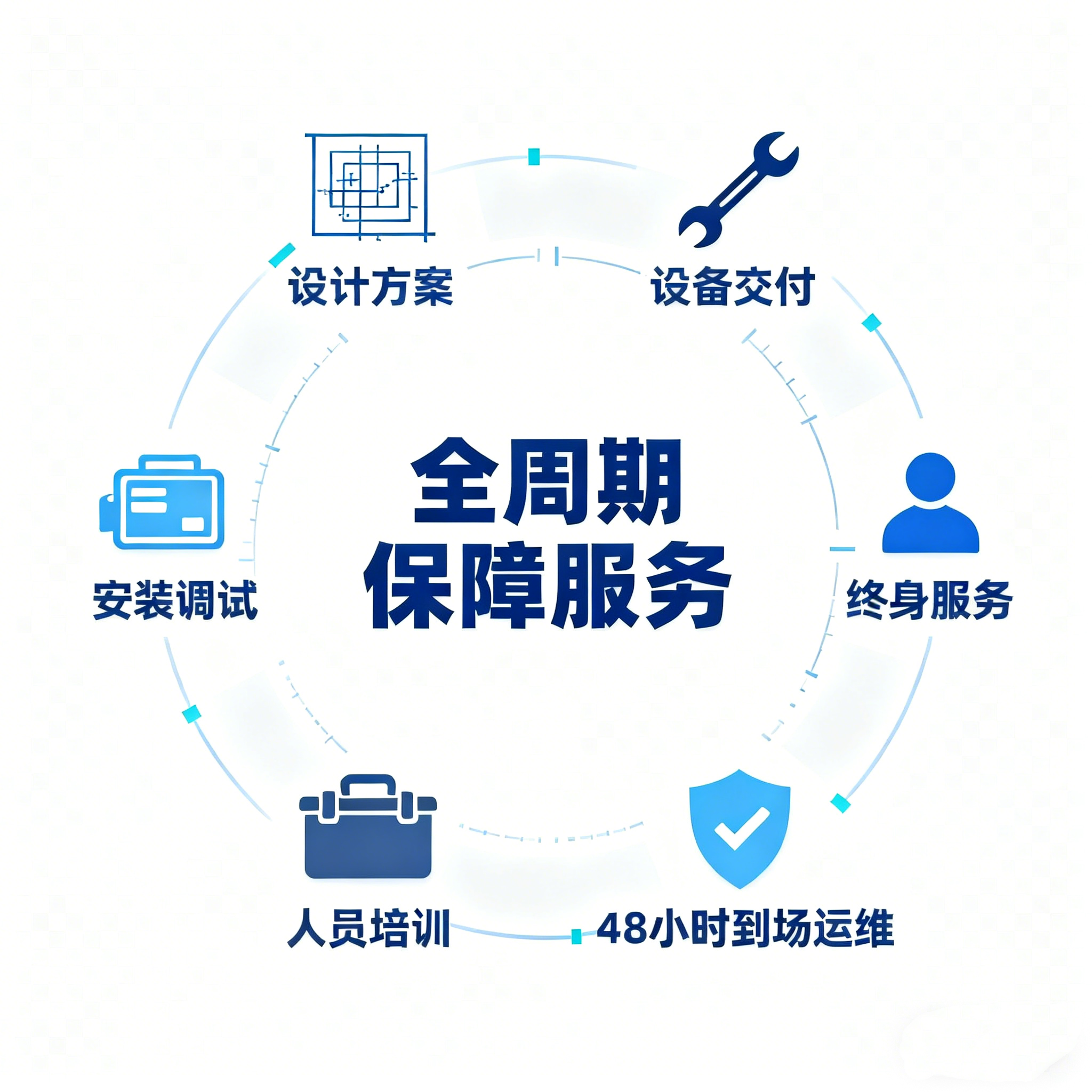 從設計方案到設備交付 全周期保障提供安裝調試、人員培訓、48 小時到場運維等終身服務。